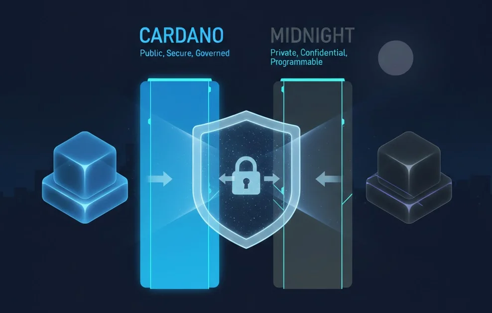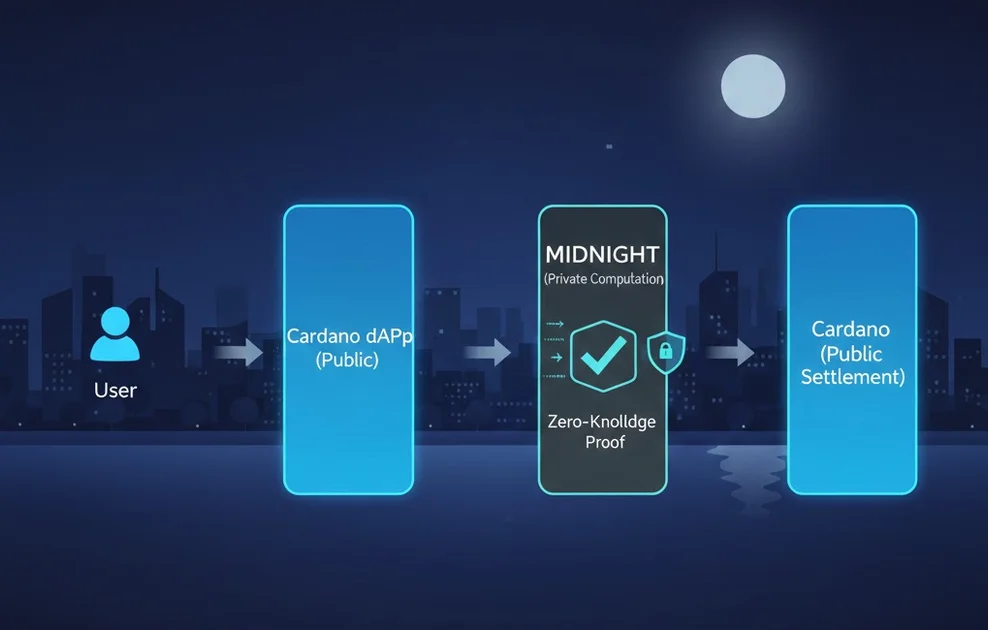 In this article, we’ll walk through a simple, conceptual flow of how a Cardano dApp can use Midnight for privacy, without going too deep into cryptography.